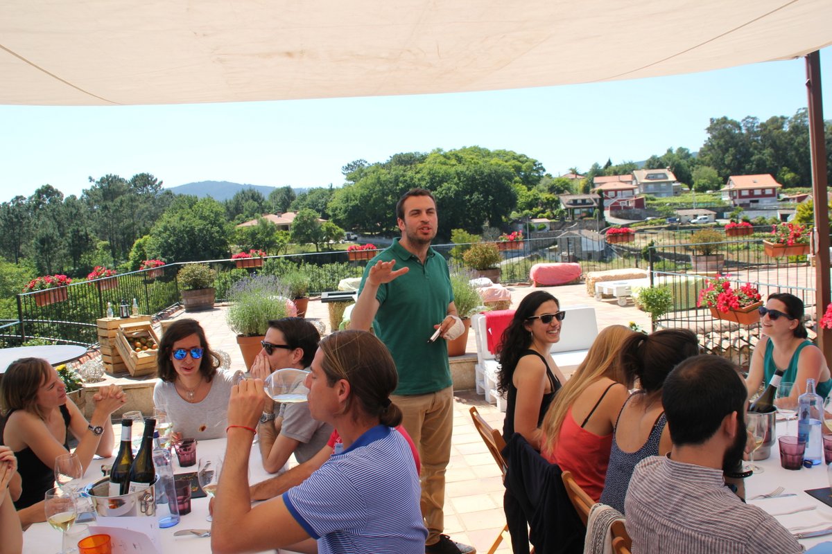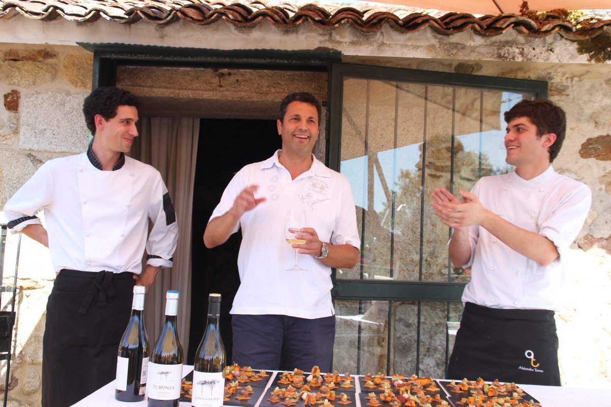 Tras la ruta, era conveniente reponer fuerzas. Así que en la Bodega Quinta de Couselo nos esperaba el enólogo de la empresa, José Manuel Juste, acompañado del cocinero Alejandro Torres. Ambos elaboraron un maridaje entre los vinos y la deliciosa comida que nos esperaba.