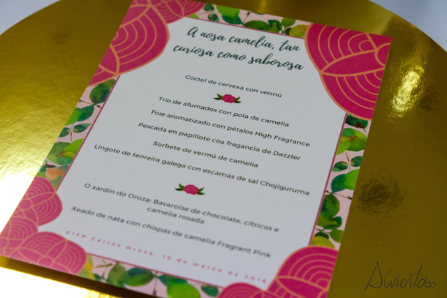 El menú que pudimos probar estaba compuesto por platos tan originales como Trío de afumados con pola de camelia, Foie aromatizado con petados High Fragance, Pescada en papillote con fragancia de Dazzler, Lingonte de tenreira galega con escamas de sal Chojiguruma y de postre O xardin do Oroza: Bavaroise de chocolate, cítricos e camelia rosada y un Xeado de nata con chispas de camelia Fragrant Pink. Como ves, toda una propuesta diferente usando como ingrediente principal diferentes tipos de camelia que le dan un toque único, exclusivo y diferente a este menú.