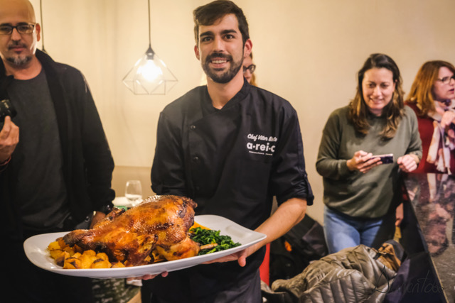 Este año la XIII Semana Gastronómica del Capão de Freamunde se celebra entre el 1 y el 13 de diciembre y participan en ella unos 13 restaurantes entre ellos el restaurante Areia donde cené y pude probar la estupenda preparación de su cocinero Vitor Brito vencedor del concurso del año pasado, un joven cocinero a los fogones del restaurante Areia en el centro de Paços da Ferreira y estupendo lugar para comer cualquier época del año. Hay dos concursos, uno al mejor capón vivo y otro a la mejor receta. Así que a los capones vivos hay criadores que hasta los peinan cada día para tener a su capón lucido y hermoso para el concurso.