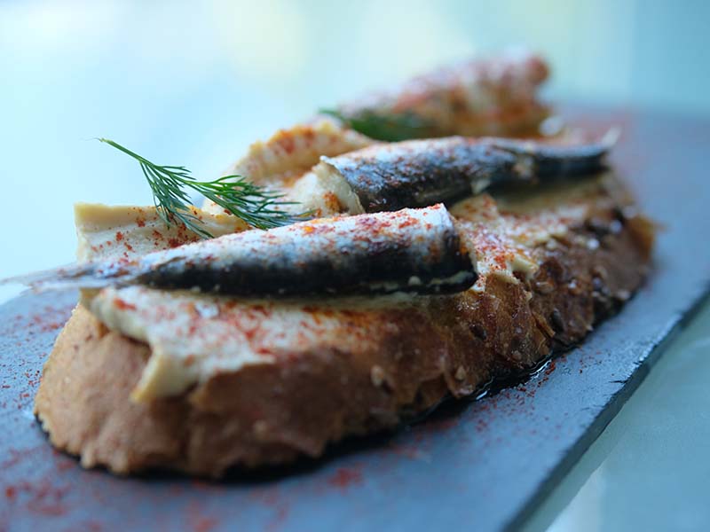 Tuesta el pan y cúbrelo generosamente con hummus, coloca tres sardinillas