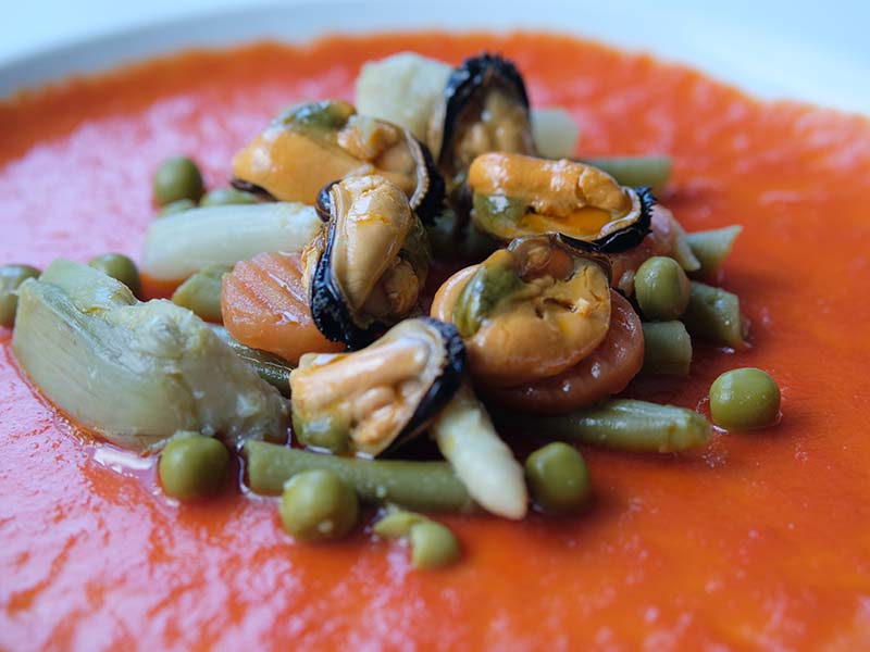 Esta receta es el ejemplo ideal de unión de tierra y mar. Se guisan las verduras refrescadas del agua de cocción y escurridas en el tomate natural a fuego bajo durante 10 minutos. Se emplata poniendo salsa de tomate en el fondo y repartiendo los mejillones y parte de la escabeche por encima del plato.