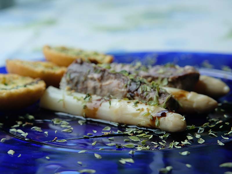 espárragos del agua de la conserva, colocar en un plato espárragos y filetes de