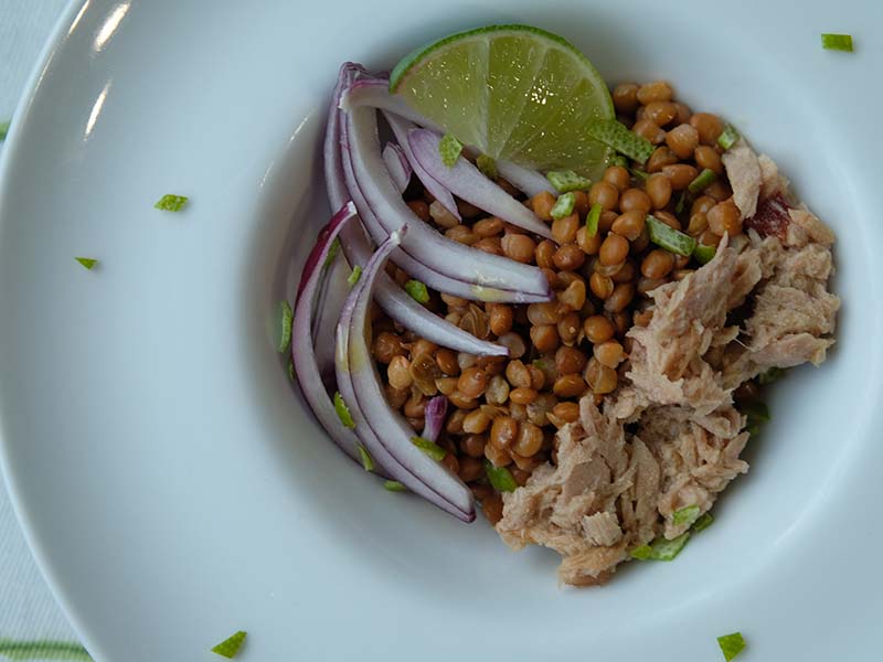 En un plato hondo coloca en el fondo las lentejas, a un lado la cebolleta y al otro el atún. Adorna con un gajo de lima y piel de lima rallada.